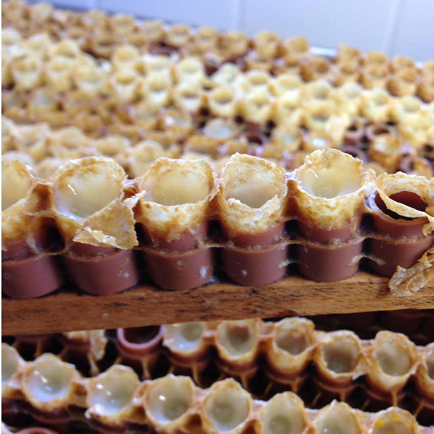 Le tour de passe-passe est que l’on va « leur faciliter la tâche » en leur donnant des larves à élever ! Larves que l’on aura préalablement prises sur un cadre et que l’on aura « greffées » délicatement dans des petites cupules sur une barrette que l’on donnera à « élever » aux abeilles … Trois jours après on récupérera la barrette pour en extraire la gelée après avoir délicatement enlevé la larve sans la blesser pour ne pas « souiller » la gelée ! Pourquoi trois jours ? c’est le meilleur ratio taille de la larve / coussin de gelée ! Et oui, c’est pas vegan !